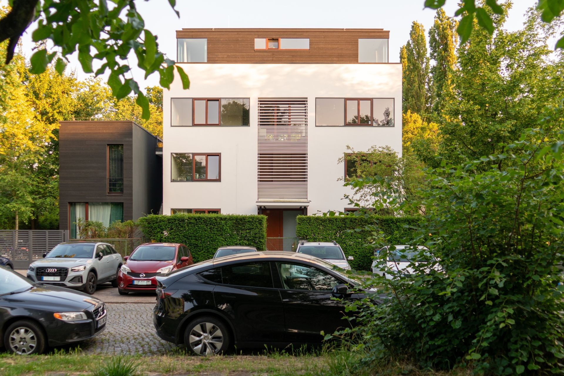 On a verdant plot in Berlin, a former embassy has been transformed into a contemporary live–work house. The existing structure—clean plastered volumes, large openings, a calm grid—sets the stage for a new cubic addition clad entirely in Nakamoto Forestry Suyaki. The deeply charred yakisugi forms a precise, almost floating accent: a black, tactile skin that absorbs light, reveals the wood’s grain, and lends new depth to the ensemble.
